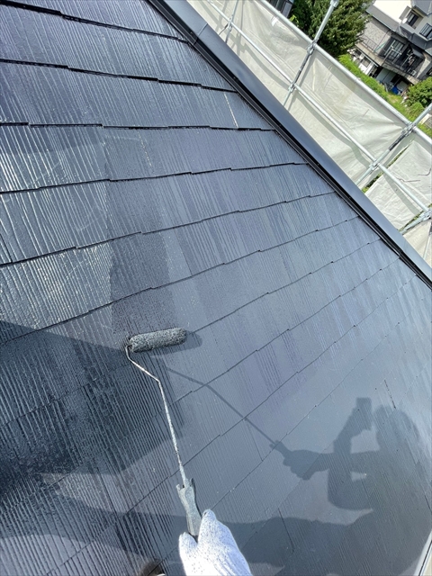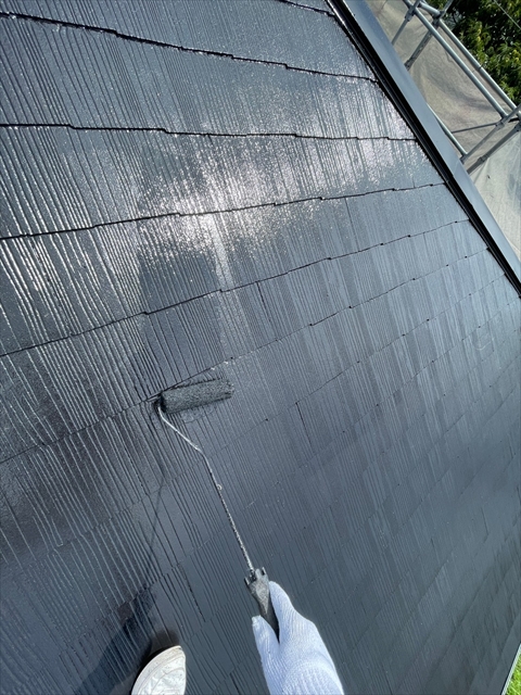 本日は大屋根の上塗り、北面・東面破風・横樋塗りを行いました。