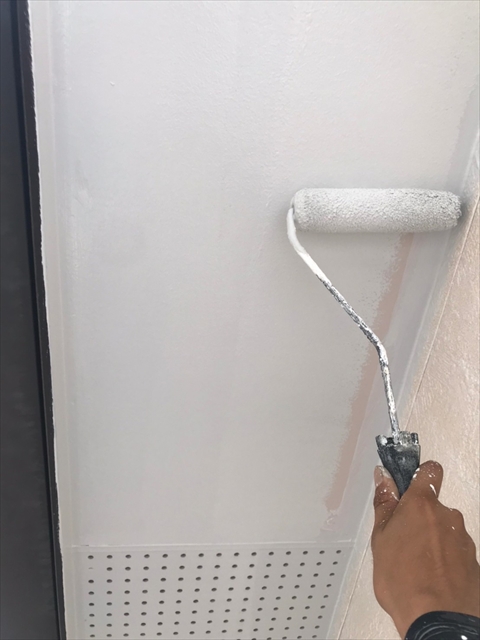 今日北・西・南面の横樋・破風(2回目)・東面軒天塗装(1回目・2回目)、東面下塗り、中塗り塗装、換気フード(2回目)を行いました。
