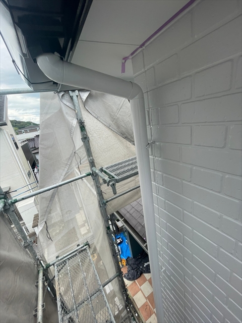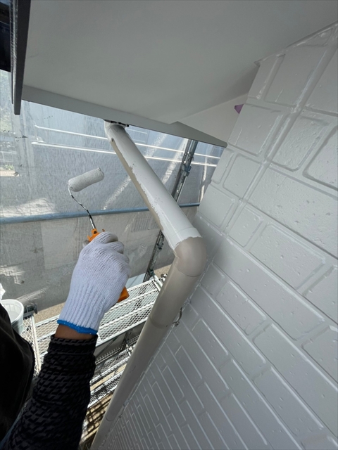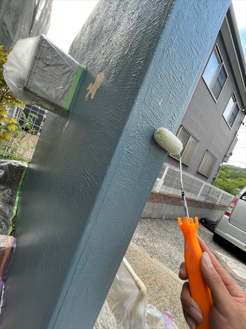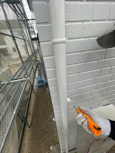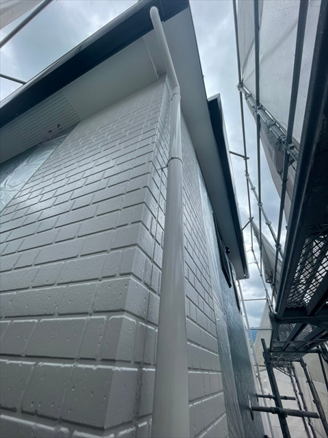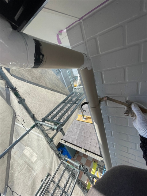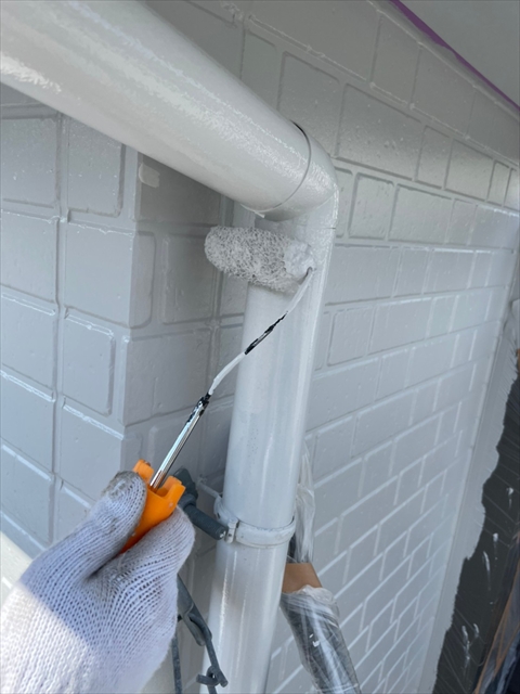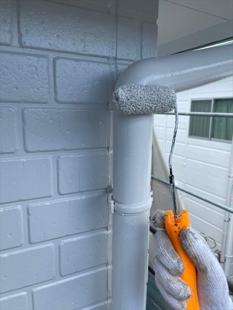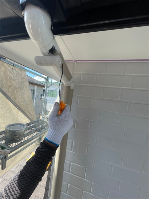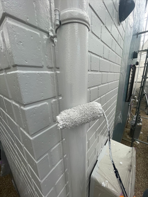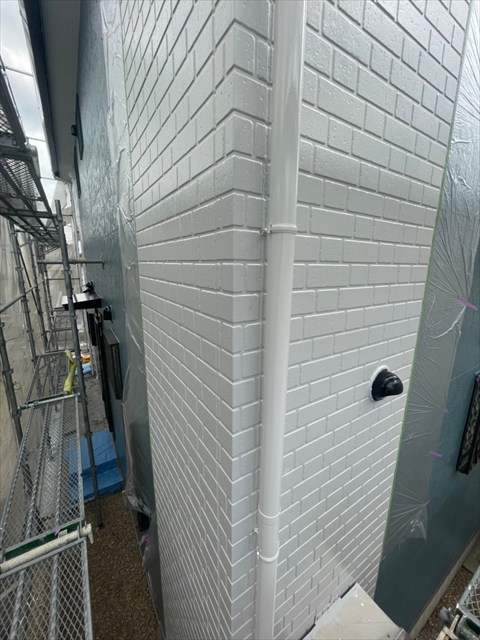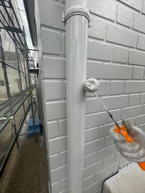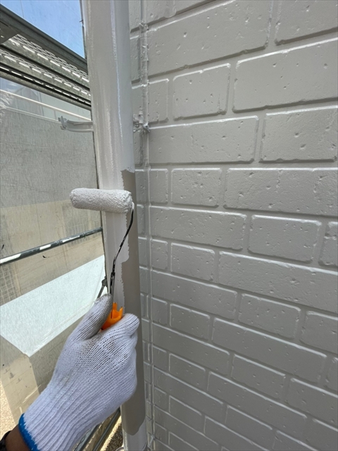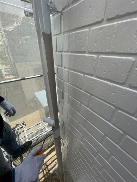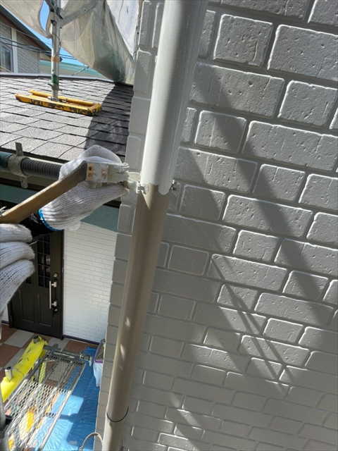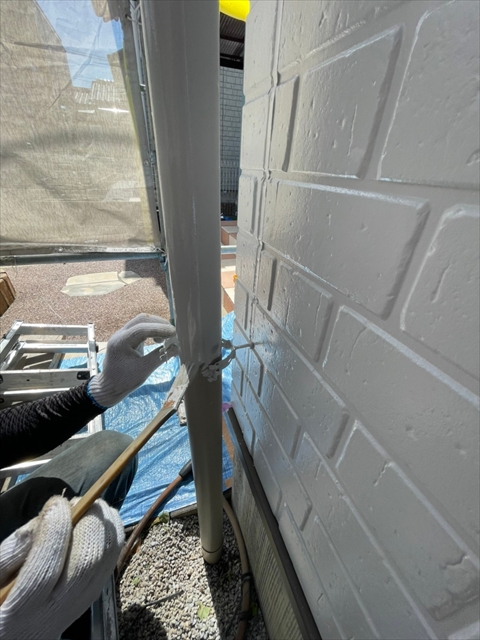 本日はタイル壁上塗り塗装、縦樋塗装1回目・2回目、門柱下塗り塗装、北面下塗り・中塗り塗装を行いました。
