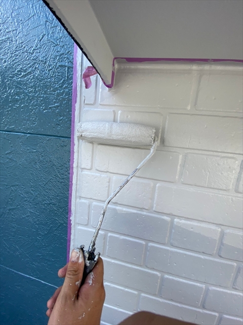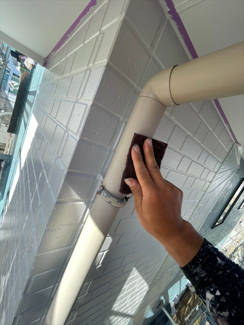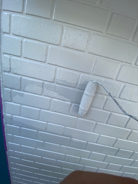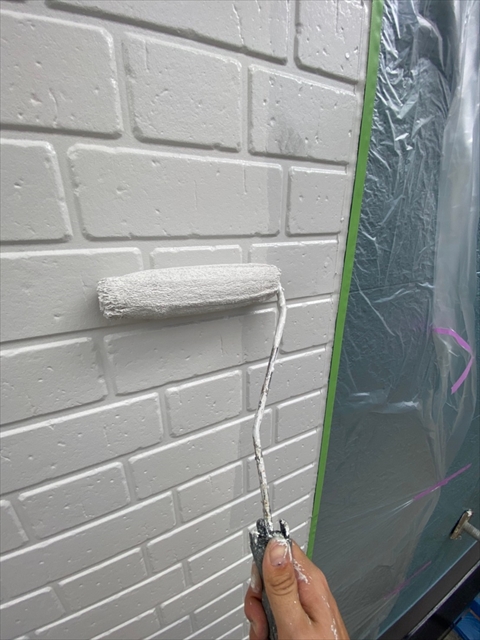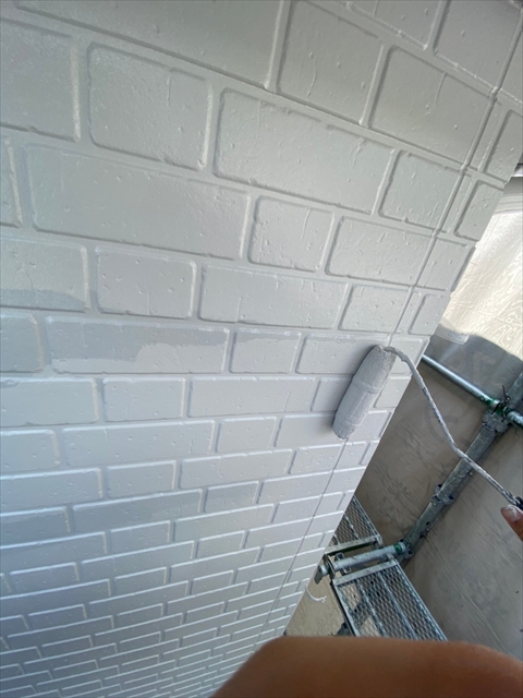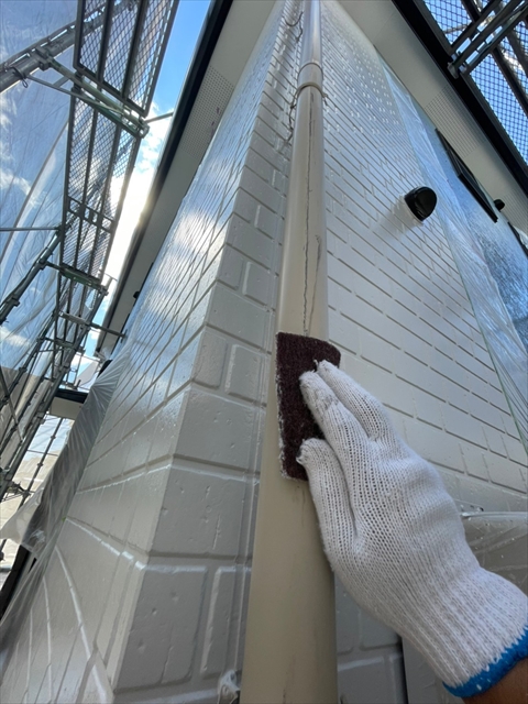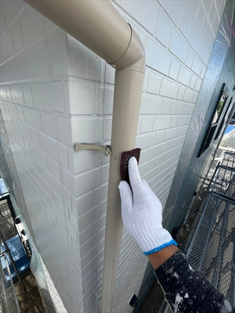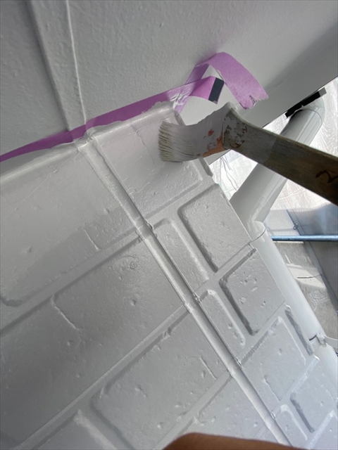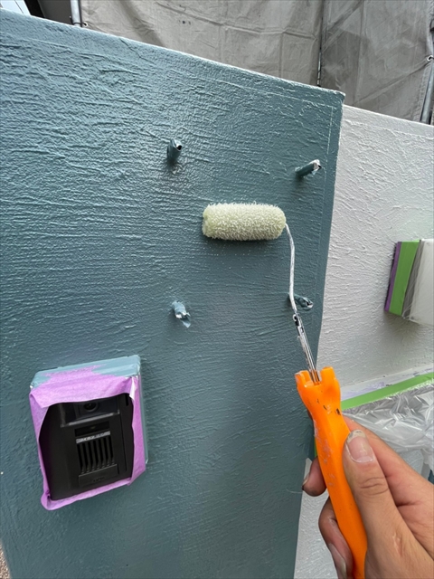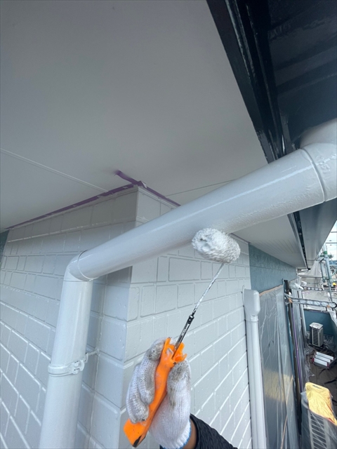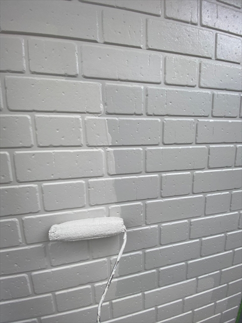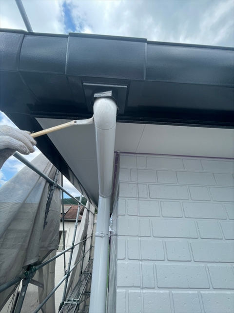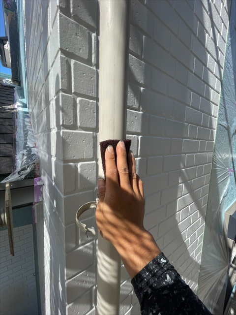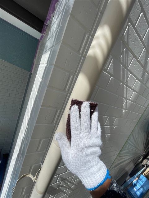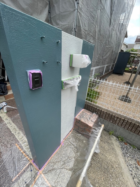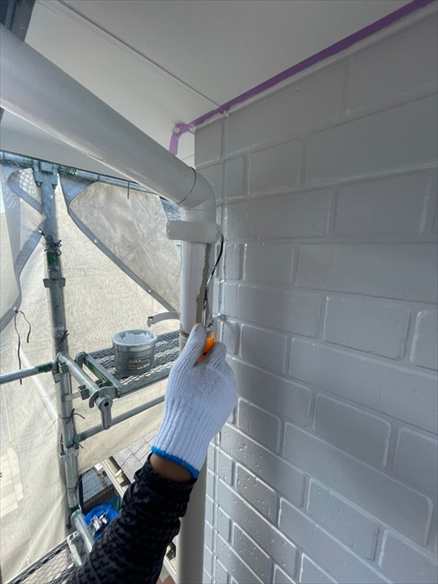 本日はタイル壁上塗り塗装、縦樋塗装1回目・2回目、門柱下塗り塗装、北面下塗り・中塗り塗装を行いました。