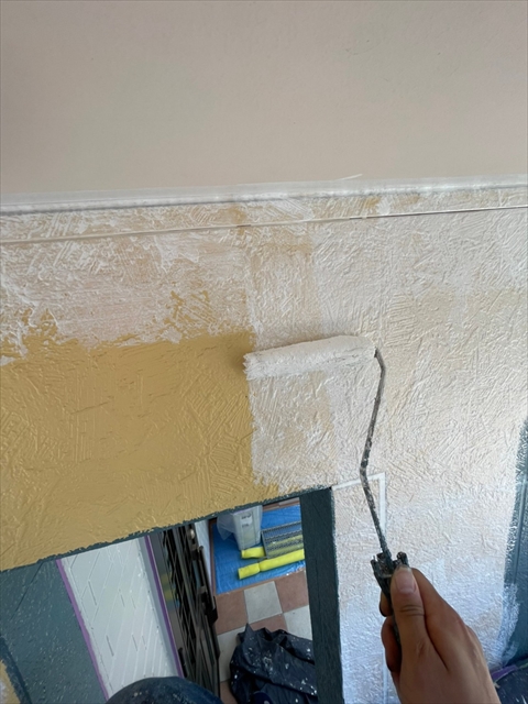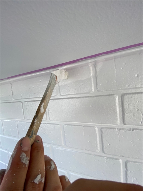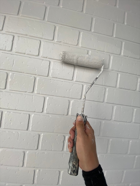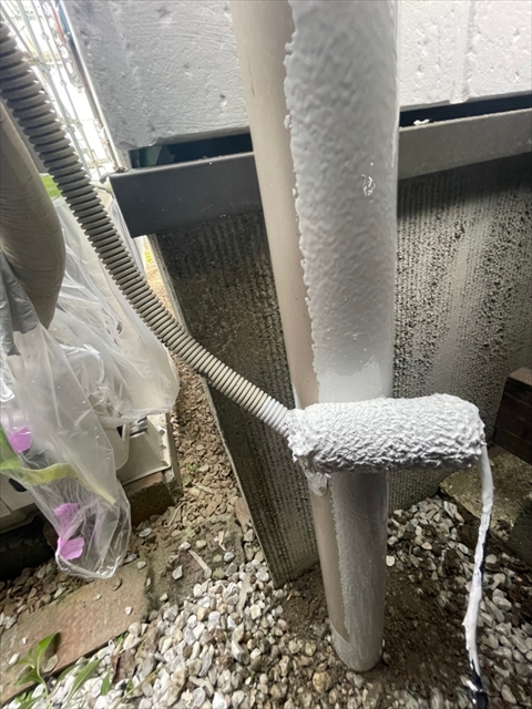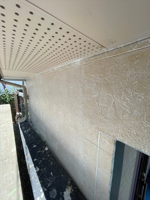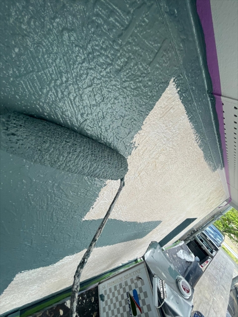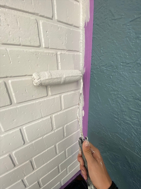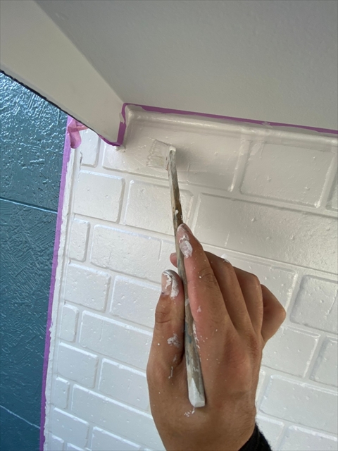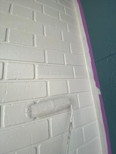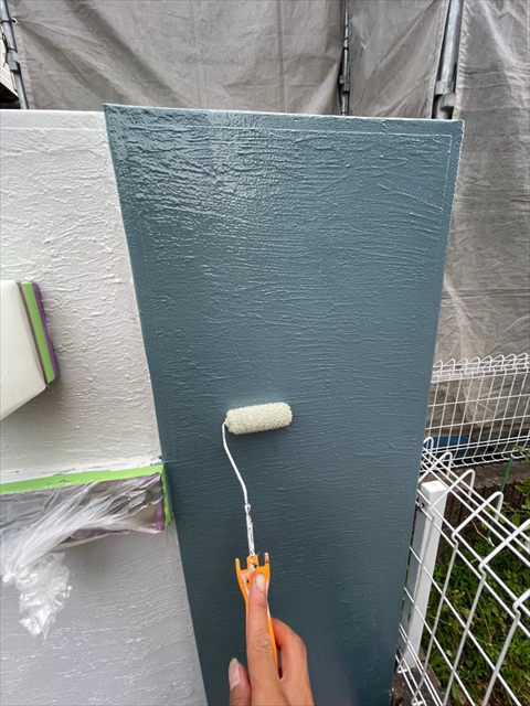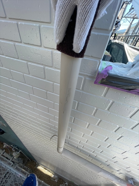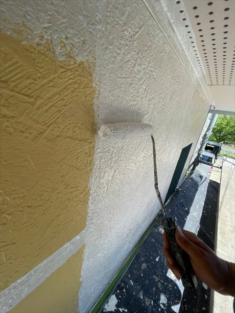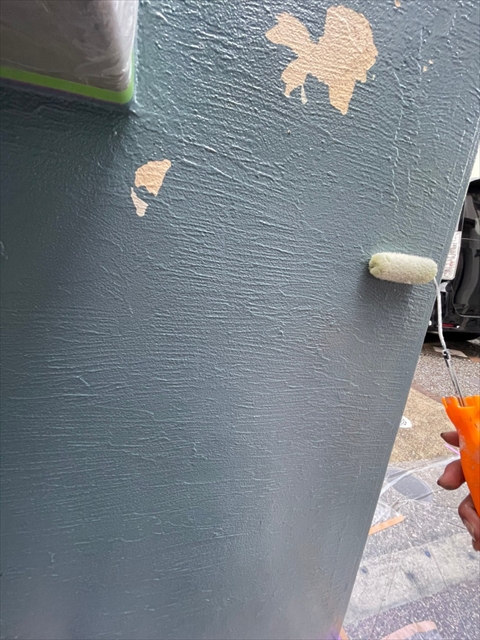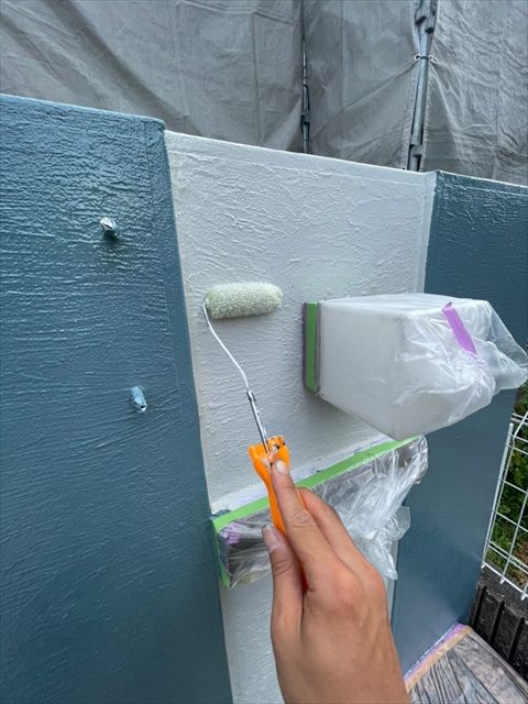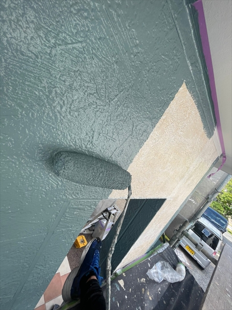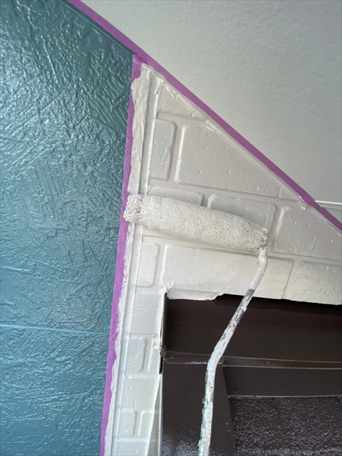 本日はタイル壁上塗り塗装、縦樋塗装1回目・2回目、門柱下塗り塗装、北面下塗り・中塗り塗装を行いました。