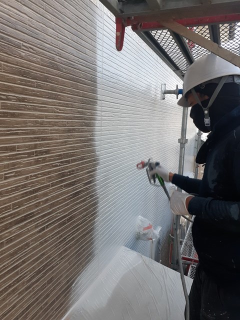 外壁サイディングの凹凸が深い為、機械とローラーを使用し、しっかりと塗装して行きました。