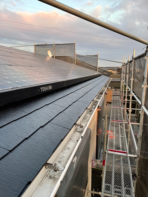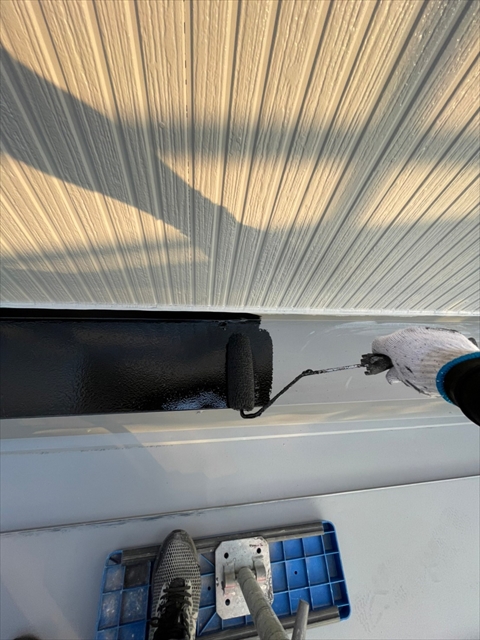 明日は下屋根の中塗り・上塗り、雨樋塗装を行う予定です。