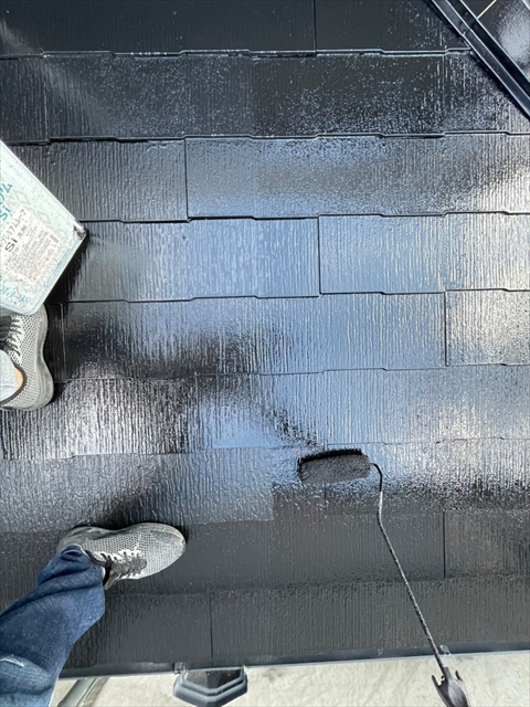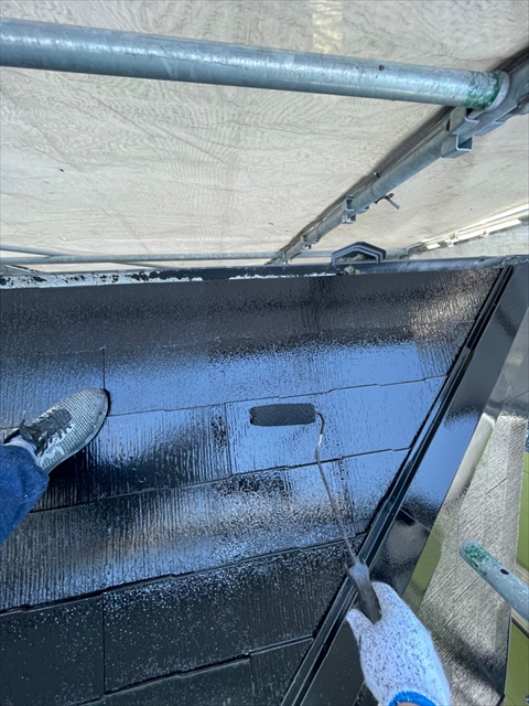 本日は下屋根の上塗り、鼻隠し・雨樋・小庇・帯の塗装を行いました。