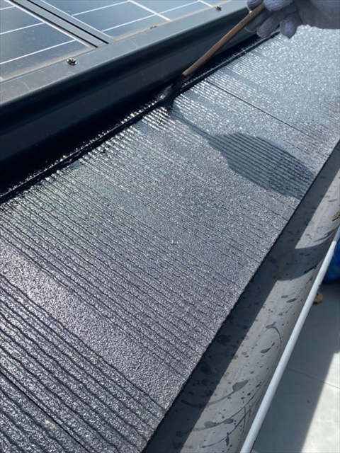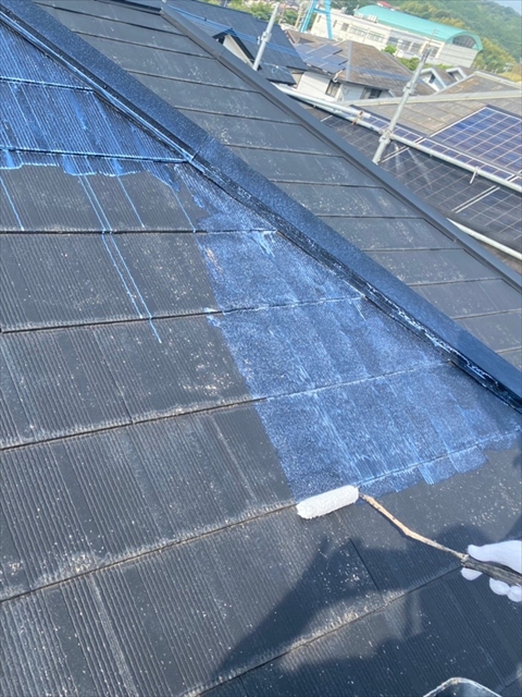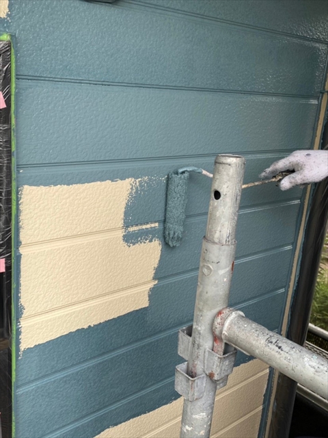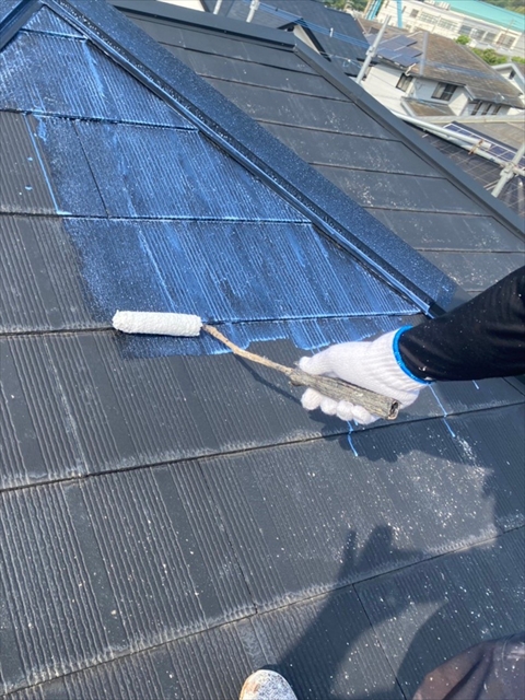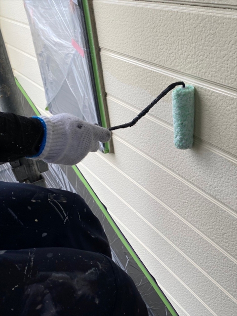 本日は養生、壁の下塗り、屋根の下塗り・中塗り、壁の中塗りを行いました。