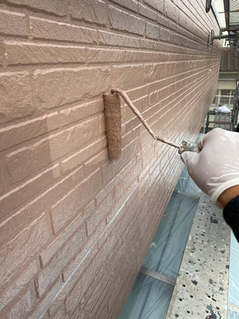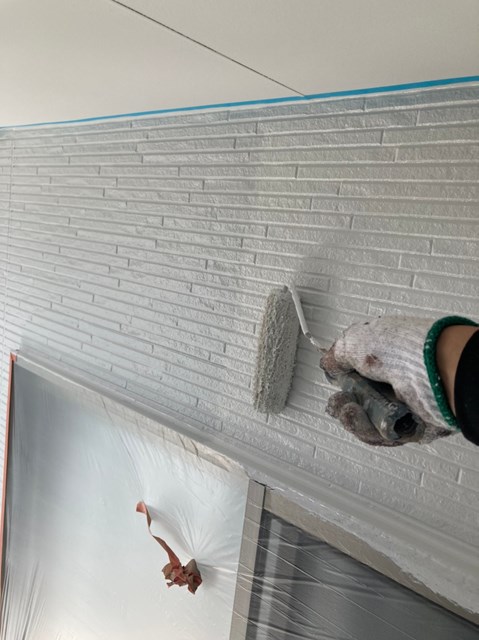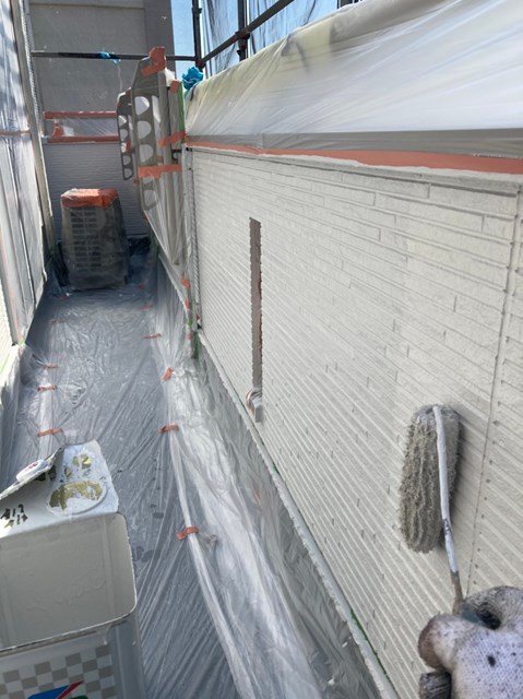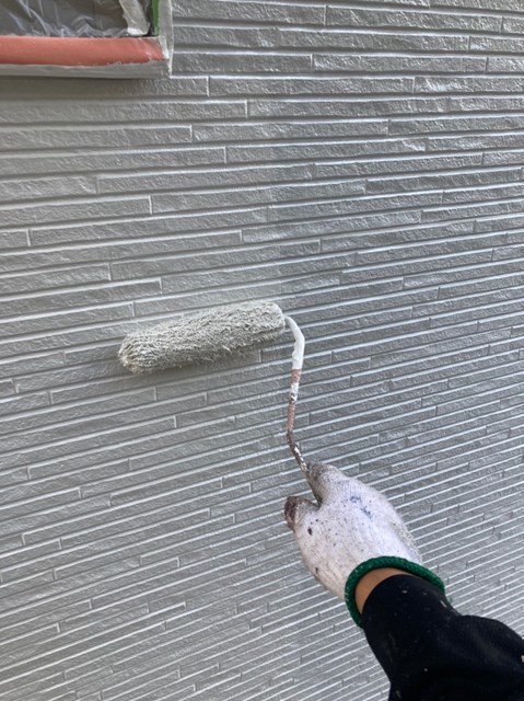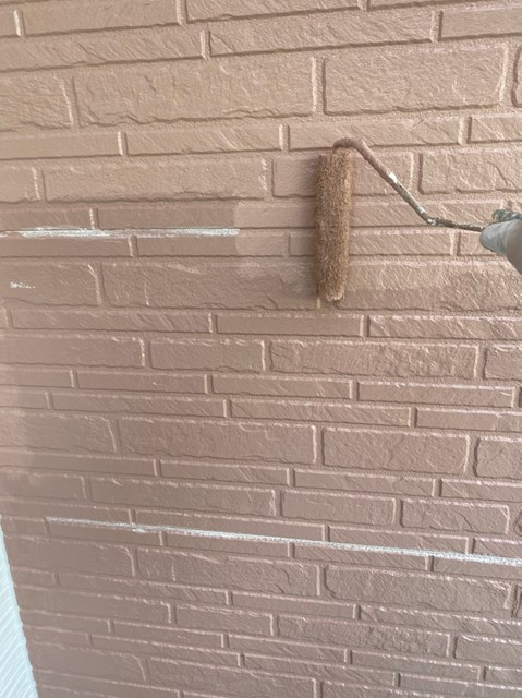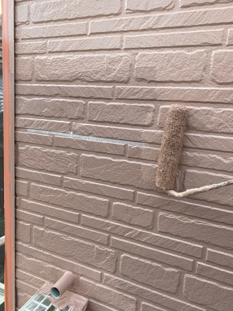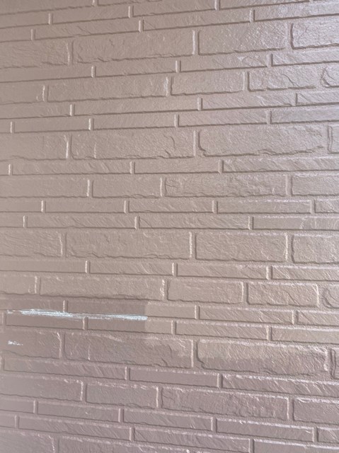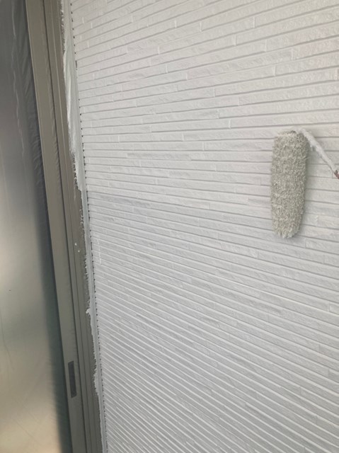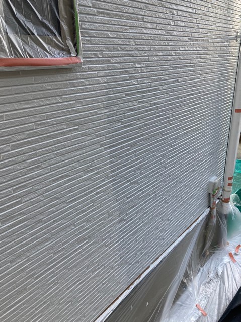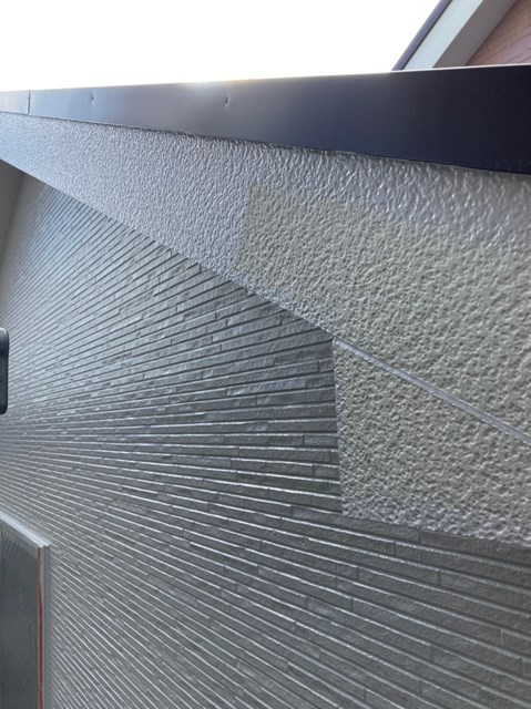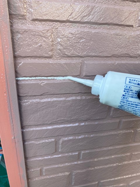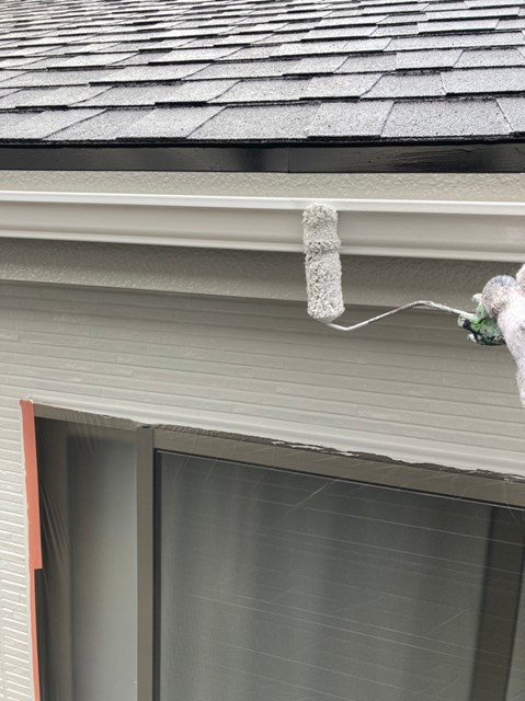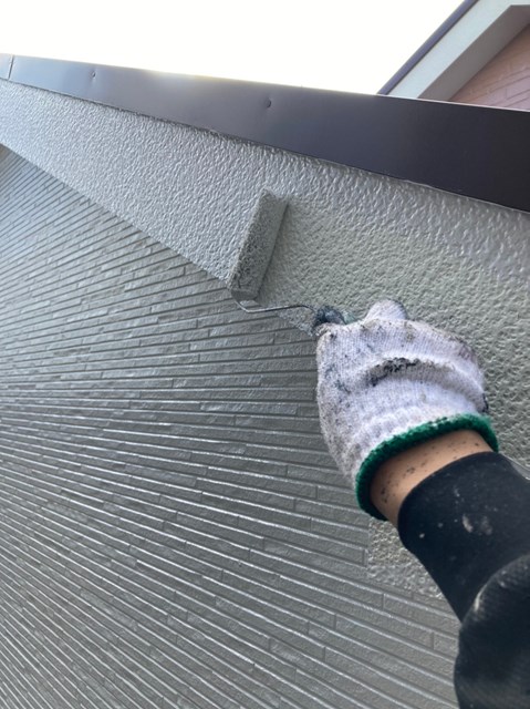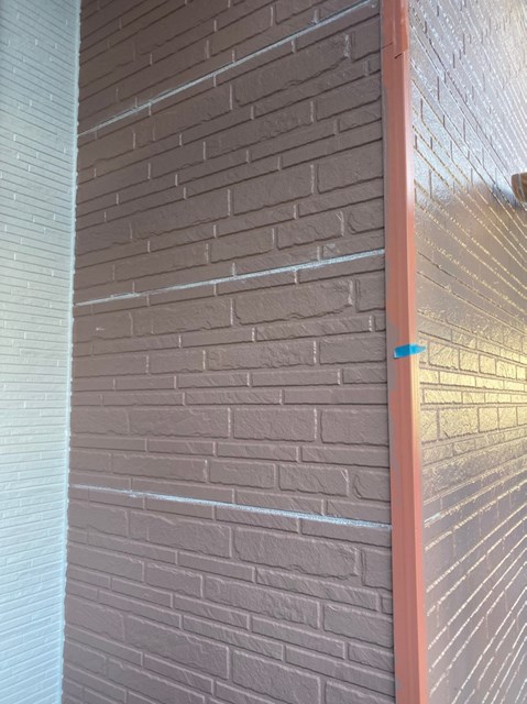 外壁は上塗りを行う前に、気になる隙間などはコーキングにて埋め戻しを行いました。
