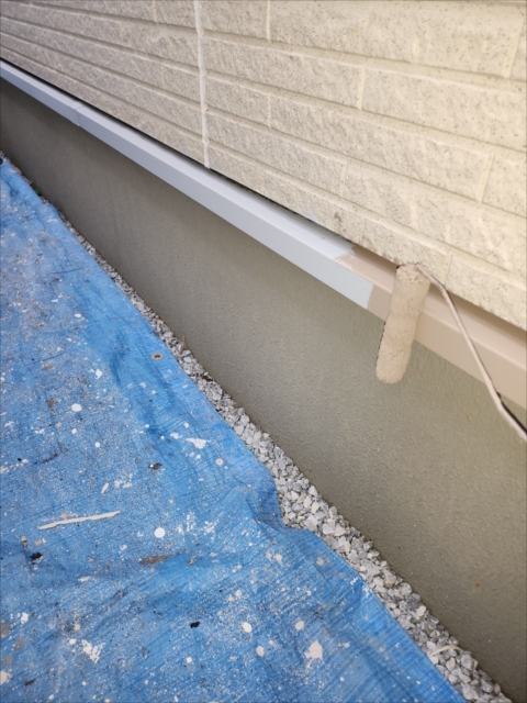 本日はシーリング養生の剥ぎ取り、付帯部・破風・シャッターBOX・庇・水切り等の鉄部に錆止め塗布・上塗りを行いました。