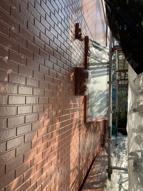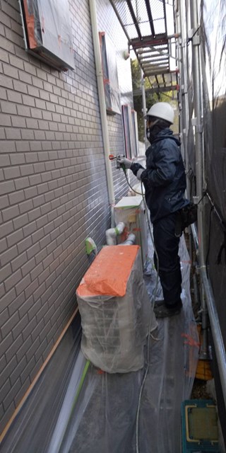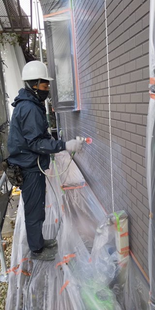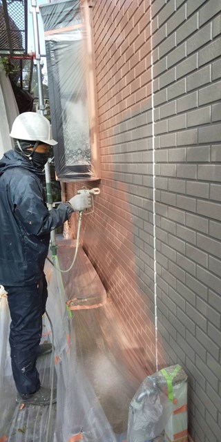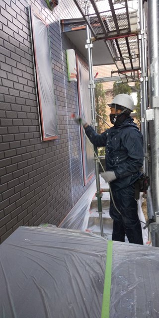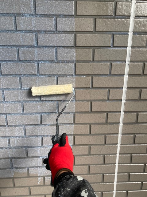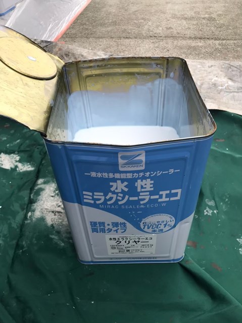 本日はまず始めに、水性ミラクシーラーエコを使用して外壁の下塗りを行いました。