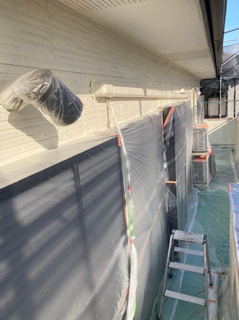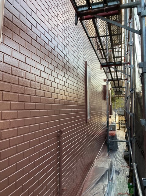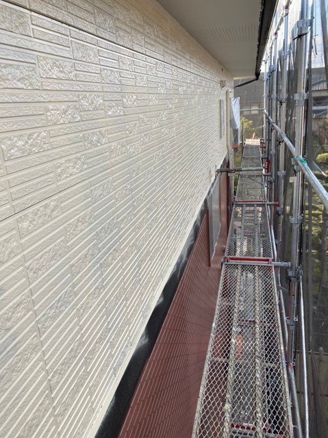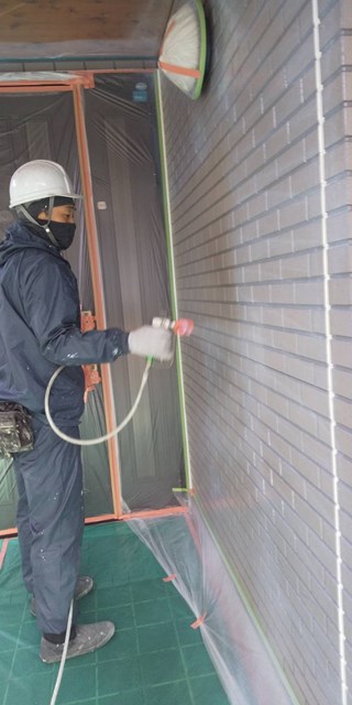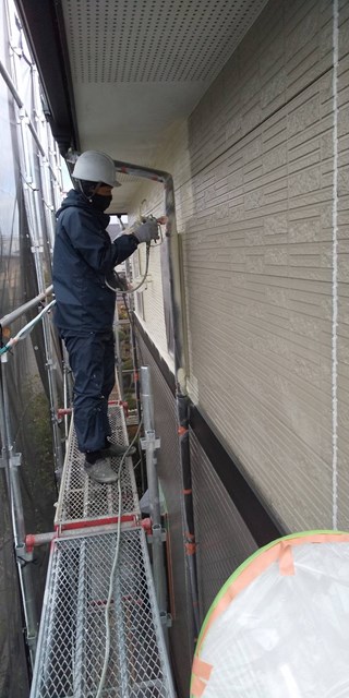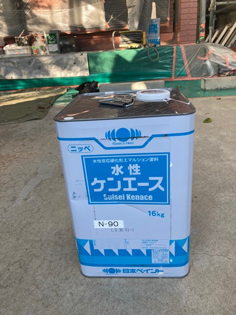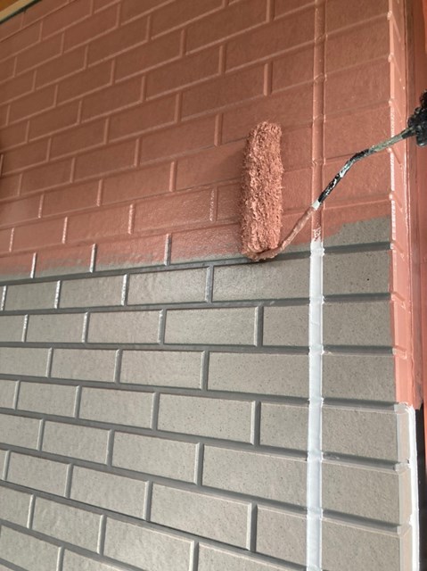 上塗りと中塗りの色を替える色変え工法を行いますので、中塗りは上塗りとは同色ではない類似色を使用しました。