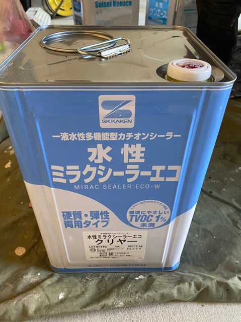 薄いオレンジ色の外壁にはミラクシーラーエコ、こちらも防カビ・防藻成分等を配合した接着剤的役割を果たす下塗り材です。