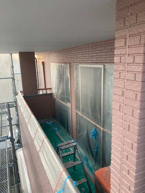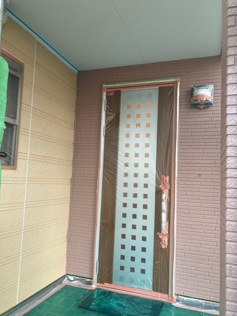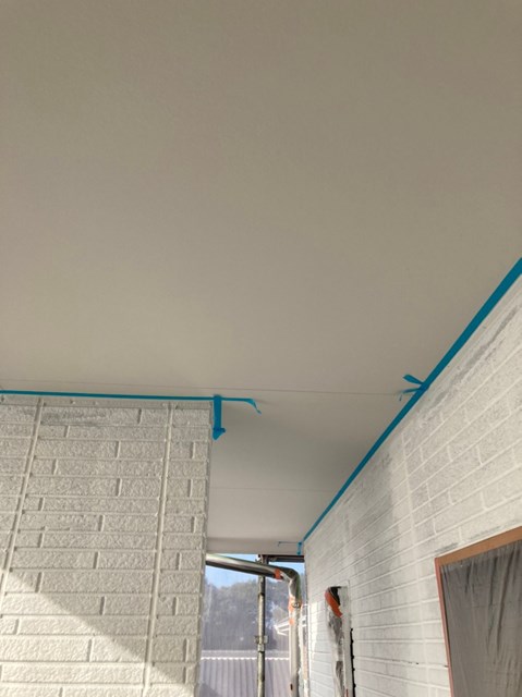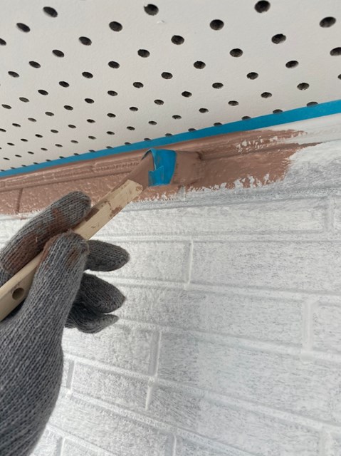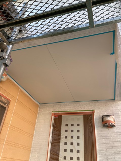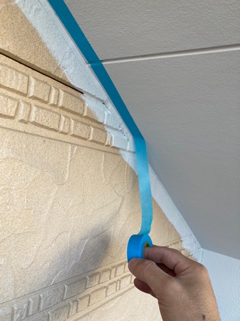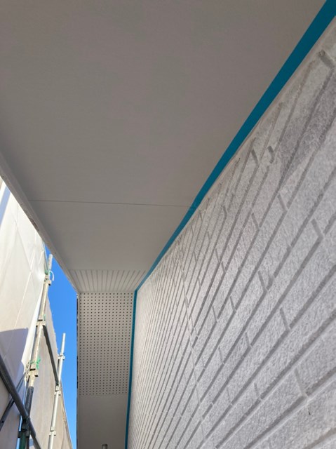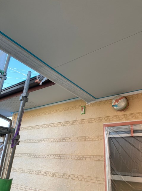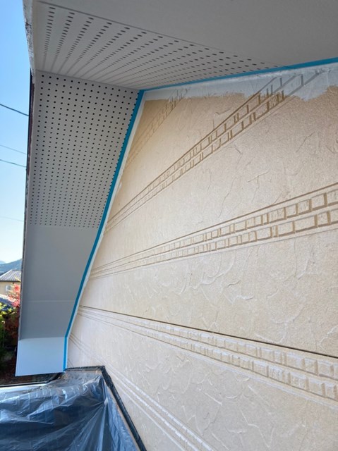 中塗りを塗装する前に軒天と外壁の繋ぎ目を綺麗なラインを出して仕上がりの美観を増す為に、マスキングテープを貼っていきました。