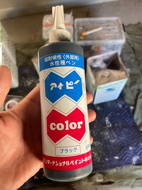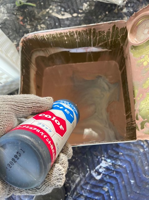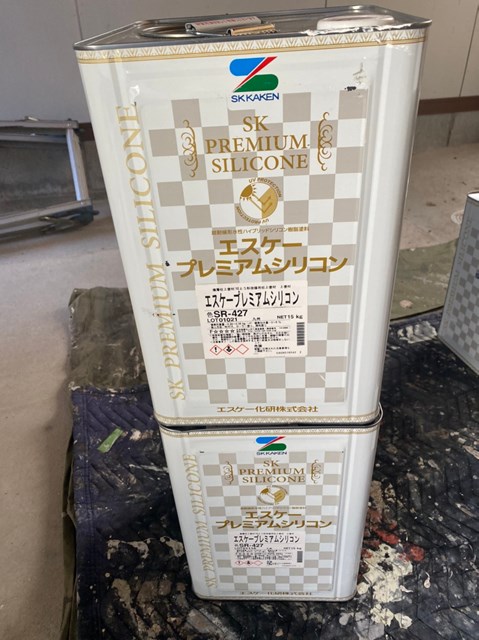 それから外壁塗装に使用する材料プレミアムシリコンに黒の種ペンを入れ、塗料を少し濃い色にしました。