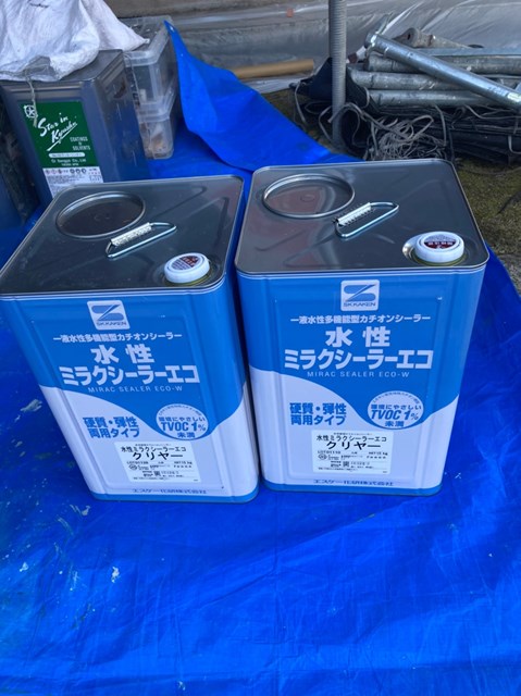 外壁に使用した水性ミラクシーラーエコは防カビ・防藻成分を配合した接着剤的な役割りを果たす外壁下塗り材です。