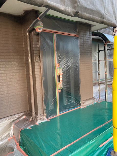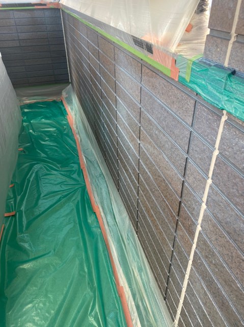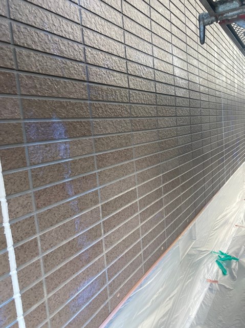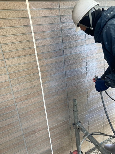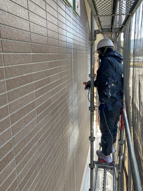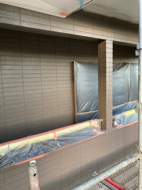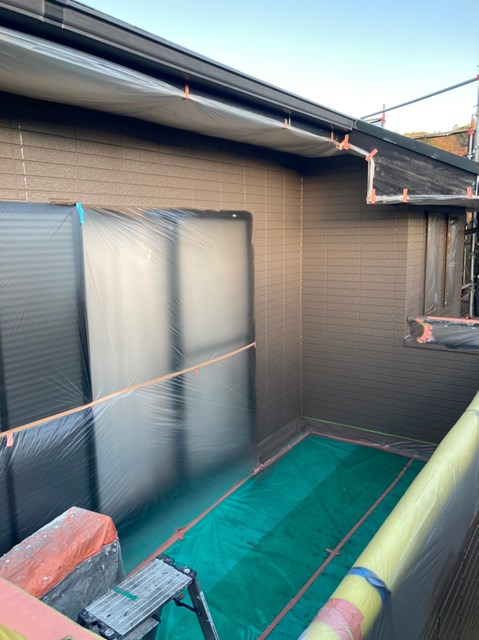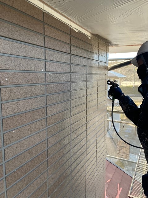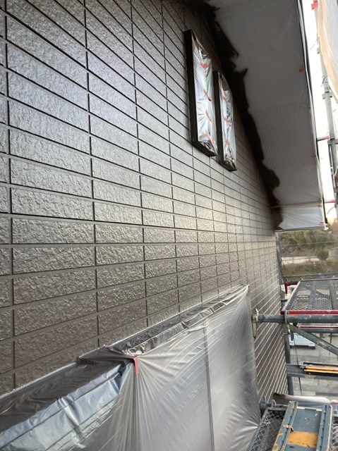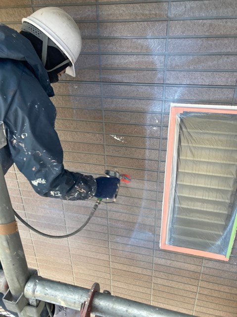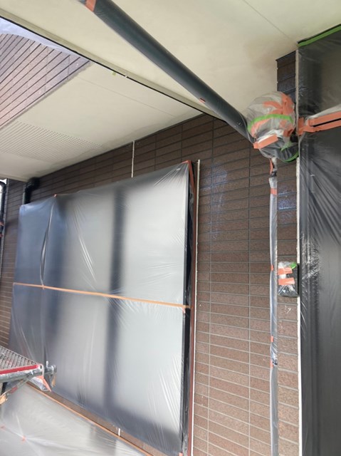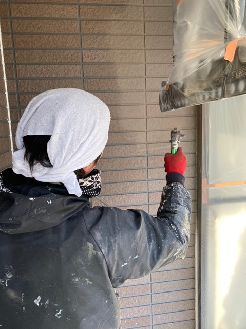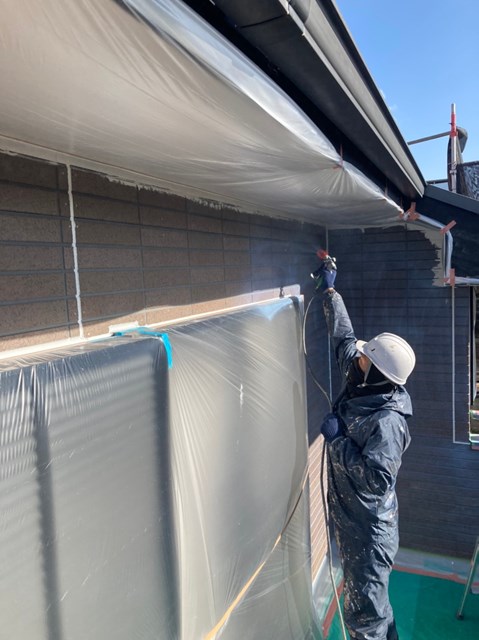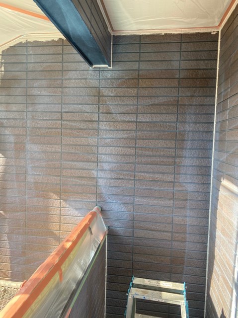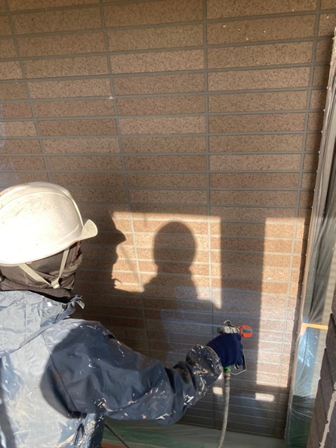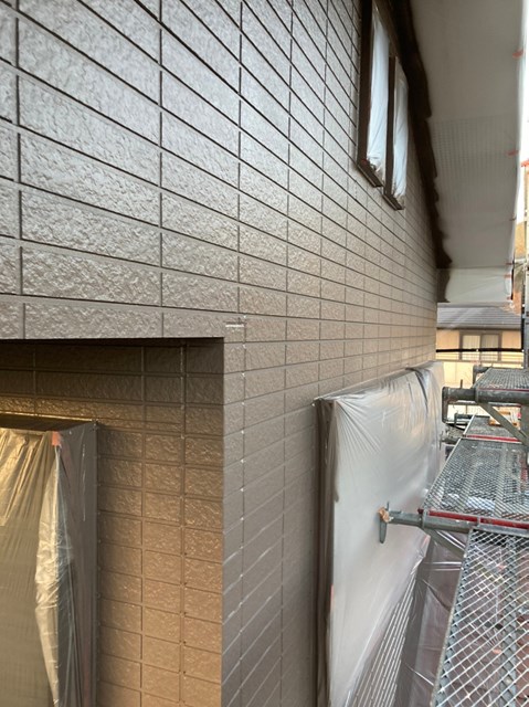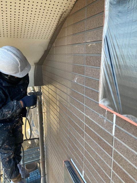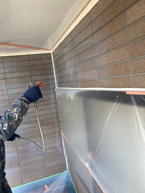 外壁は柄が深い為、細かい箇所など塗料がしっかりと奥に塗り込める様にエアレスという機械を使用し塗装しました。