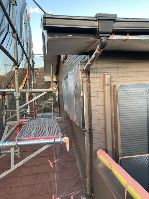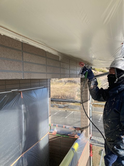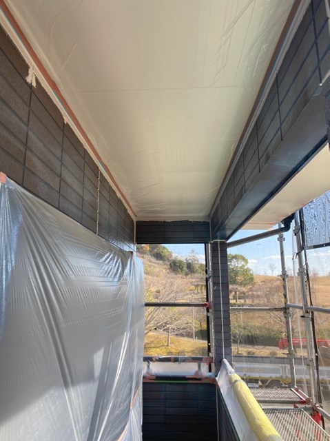 1階周りの軒天井の塗装、外壁の隙間などの埋め戻し、外壁の上塗り、大屋根の上塗り