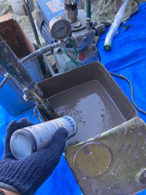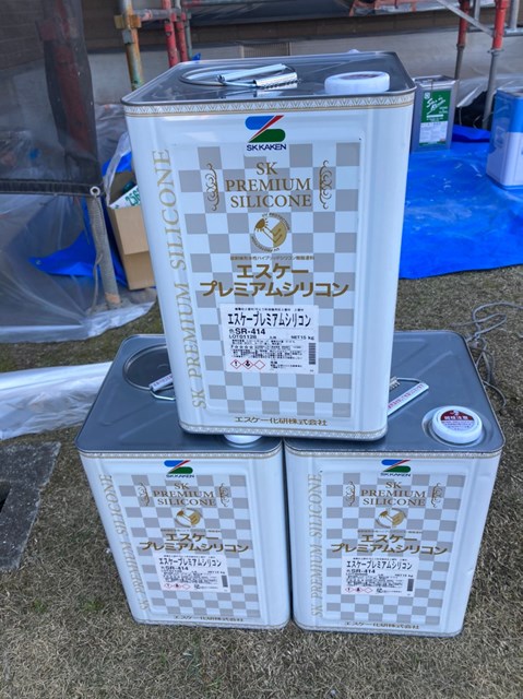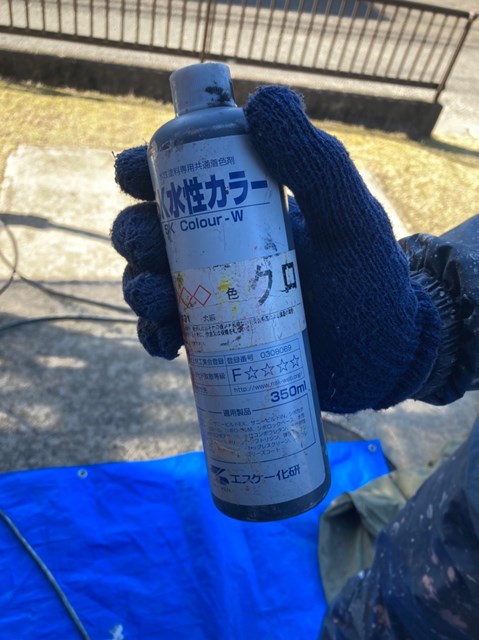 外壁塗装に使用する材料プレミアムシリコンに黒の種ペンを入れ、塗料を少し濃い色にしました。