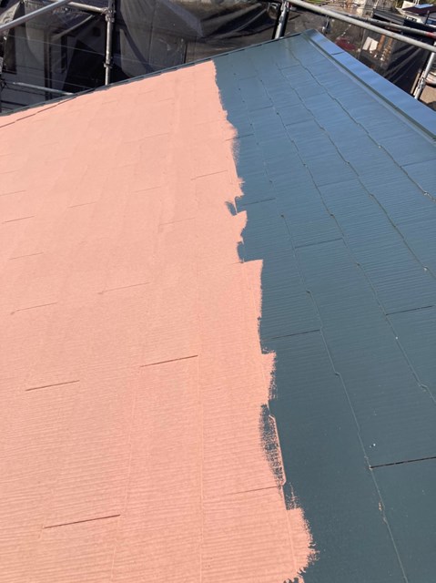 こうする事により中塗りと上塗りの色の違いが解りやすく、塗り残しや中塗りを塗らない施工を防ぐ色替え工法です。