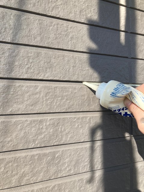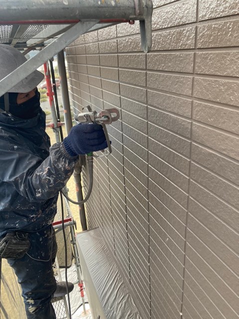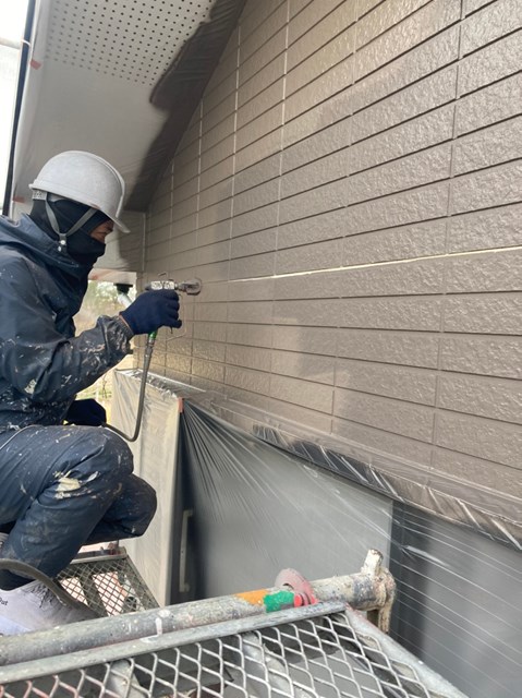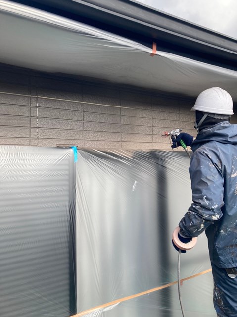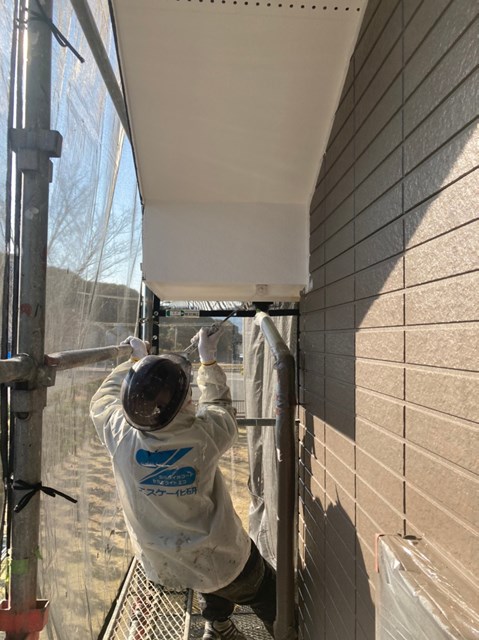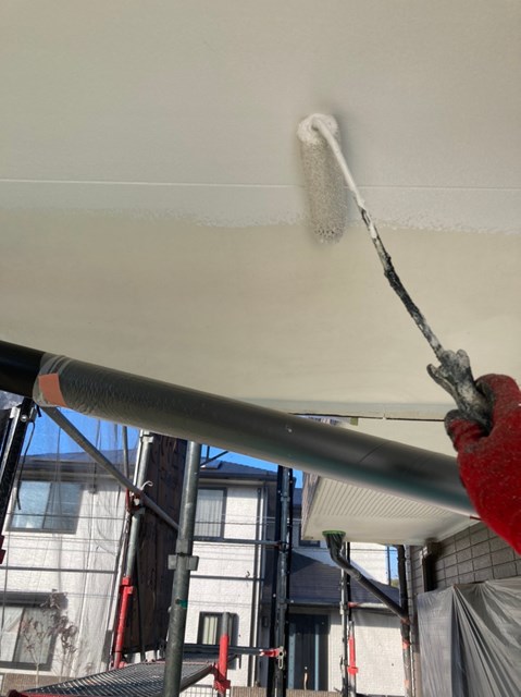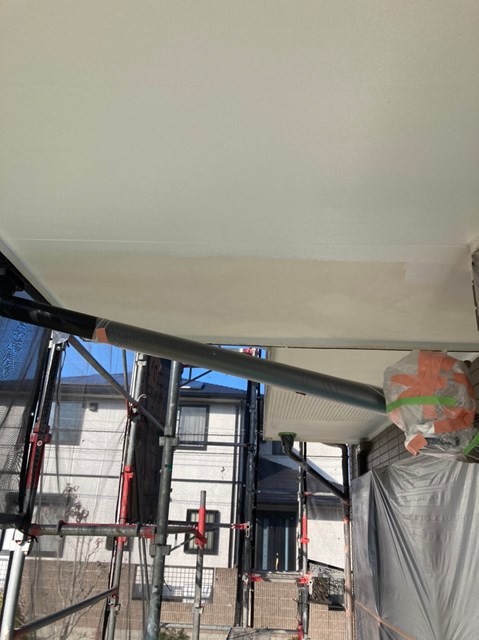 本日は1階周りの軒天井の塗装、外壁の隙間を埋め戻し、外壁の上塗り、大屋根の一部、上塗り、