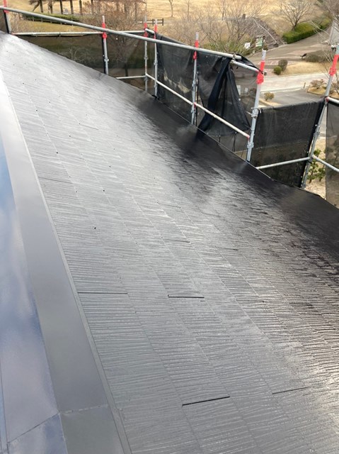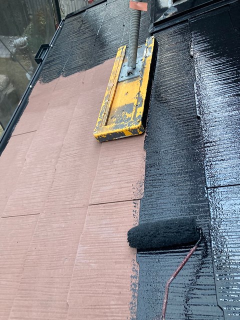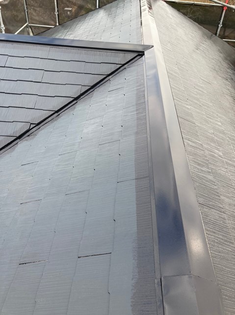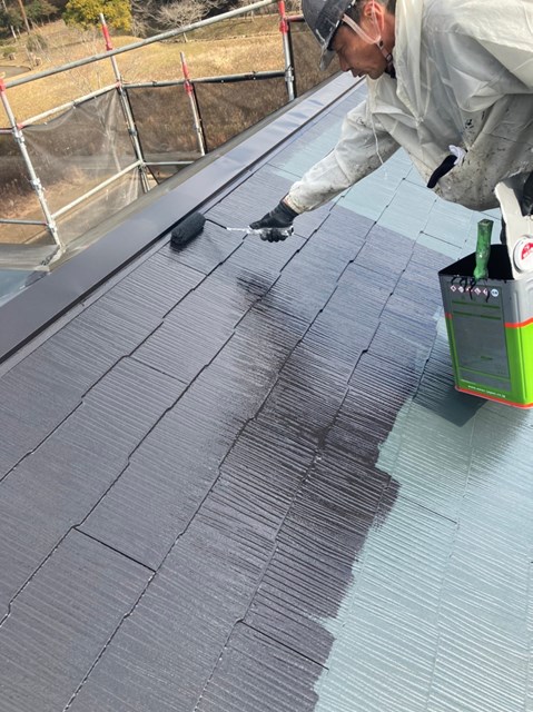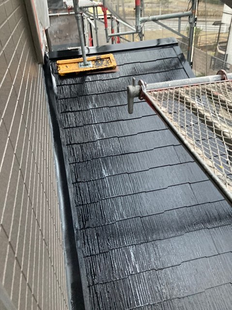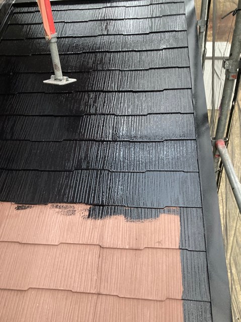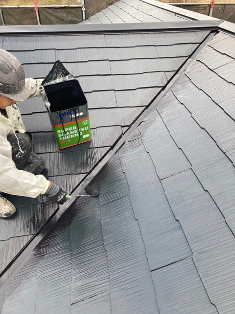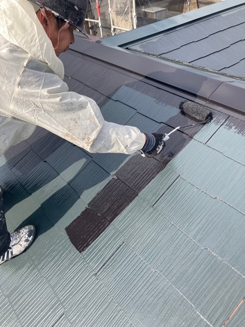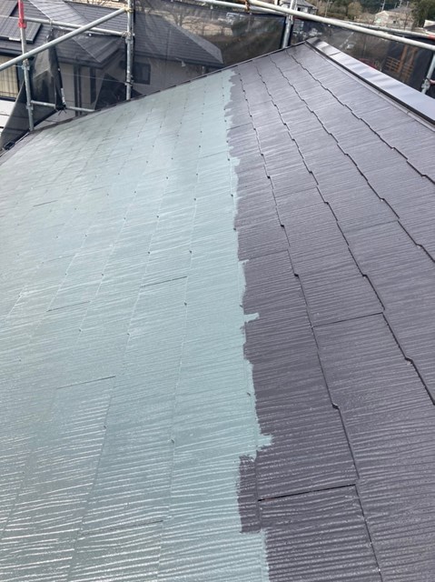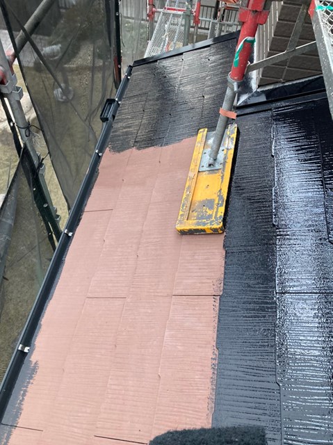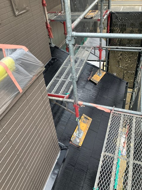 大屋根は一部上塗りを行い、下屋根は中塗りを行いました。