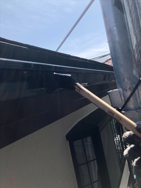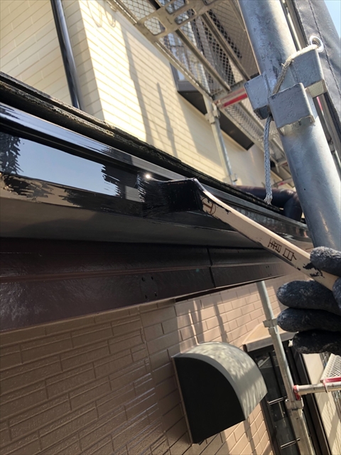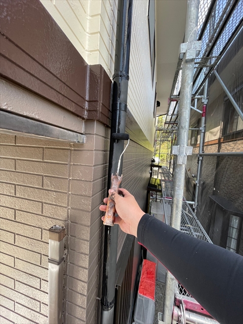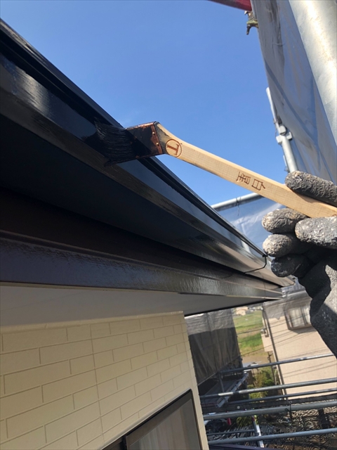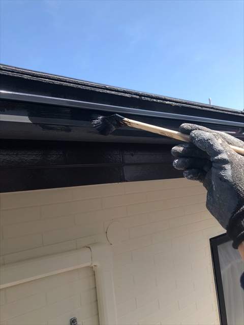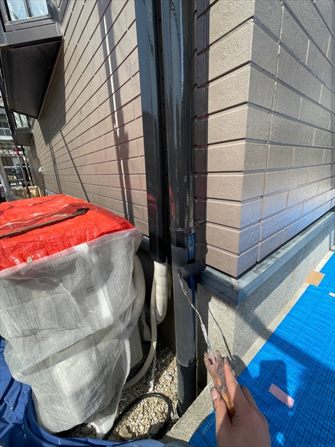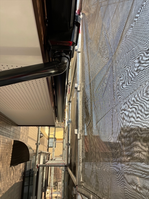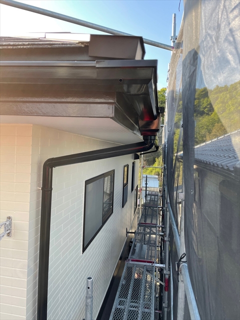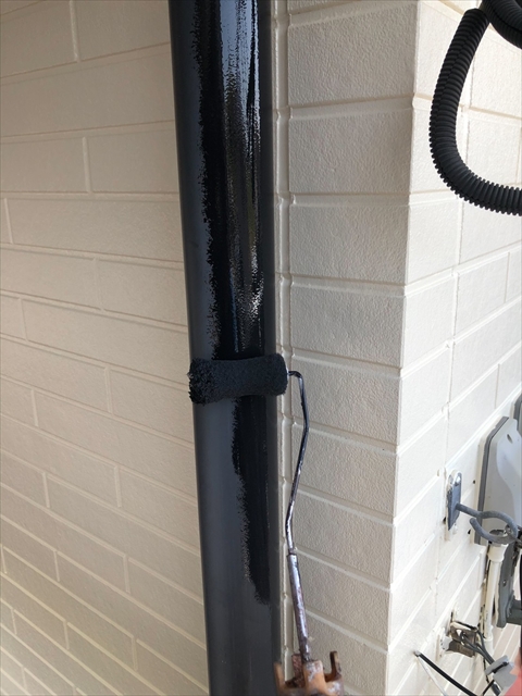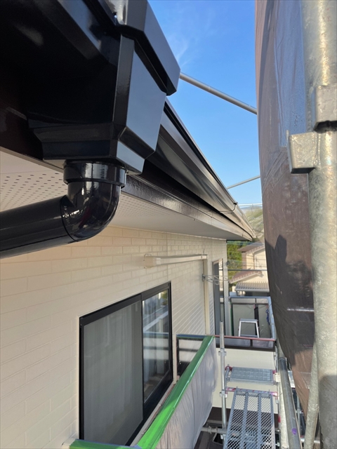 本日は日曜日ですが週明けから雨予報が多くなっている為、前倒しにて横樋、縦樋、幕板、水切り上塗りを行いました。