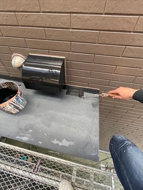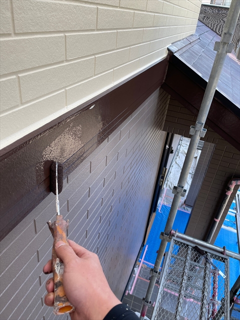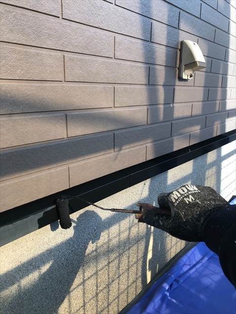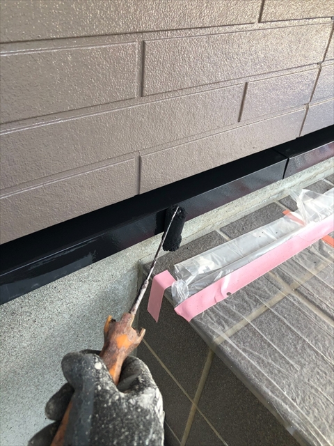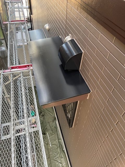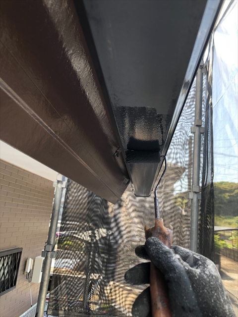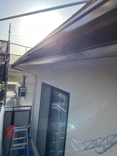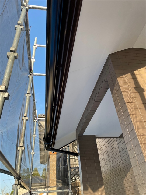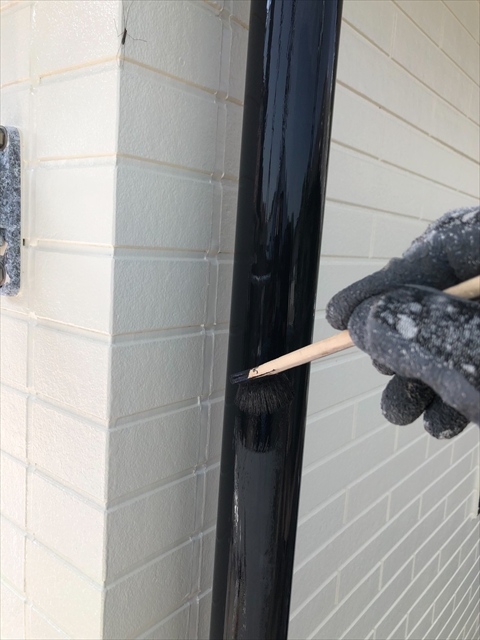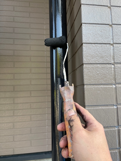 本日は日曜日ですが週明けから雨予報が多くなっている為、前倒しにて横樋、縦樋、幕板、水切り上塗りを行いました。