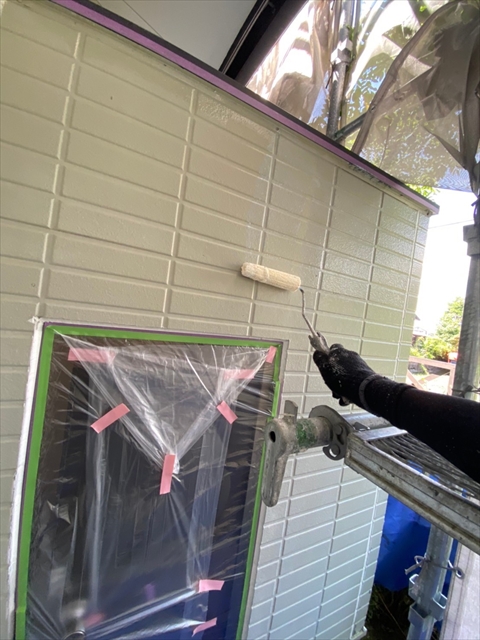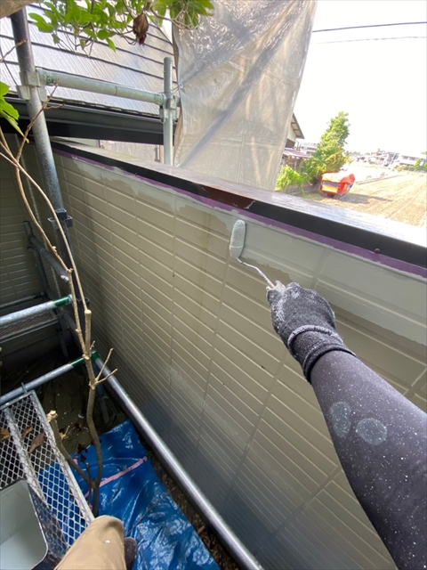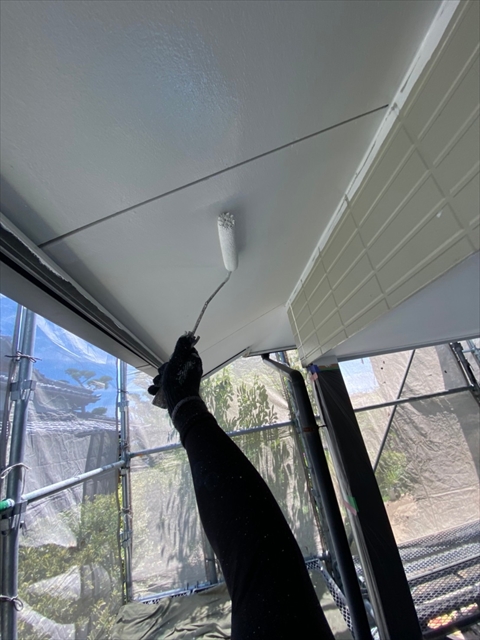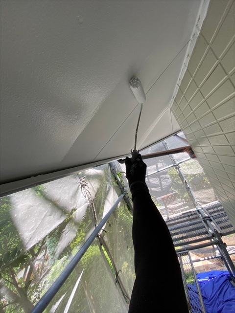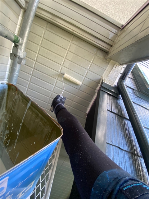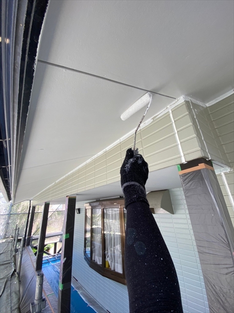 柳川市 T様邸 1F外壁上塗り 下塗り 中塗り 軒天塗り 1F横樋 破風塗り