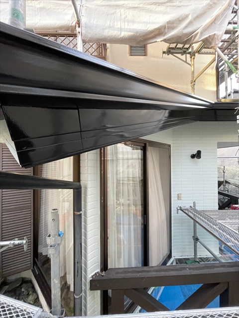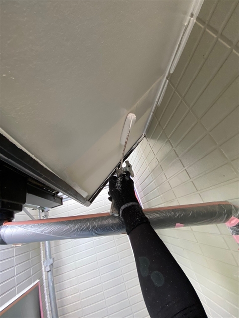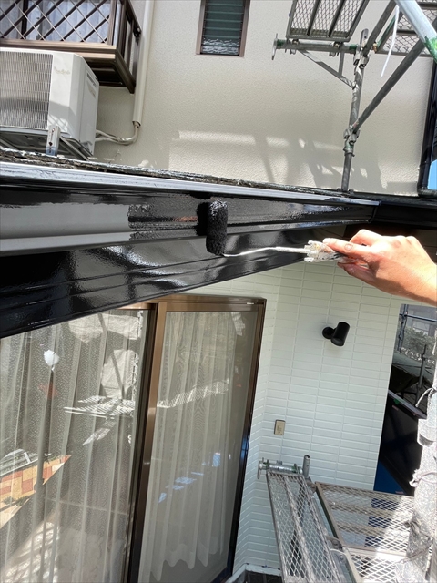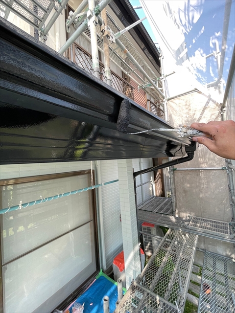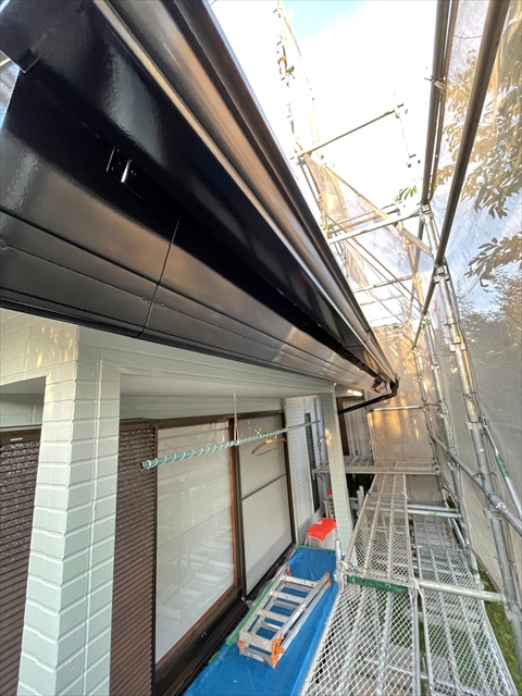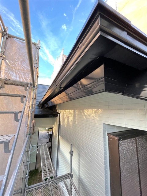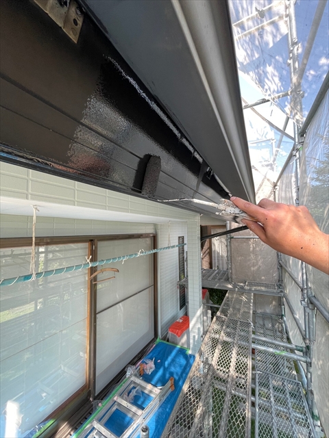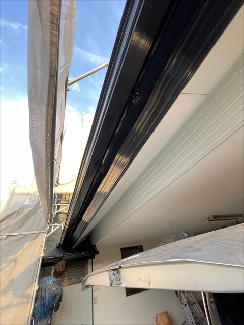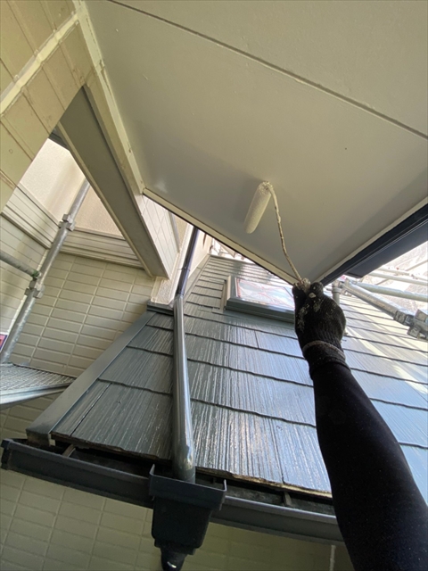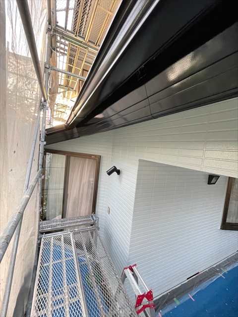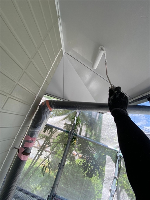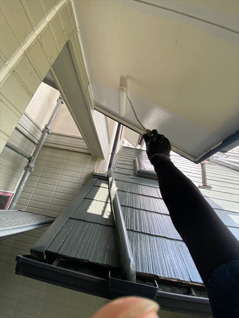 本日は1F外壁上塗り、下塗り、中塗り、軒天塗り、1F横樋、破風塗りを行いました。