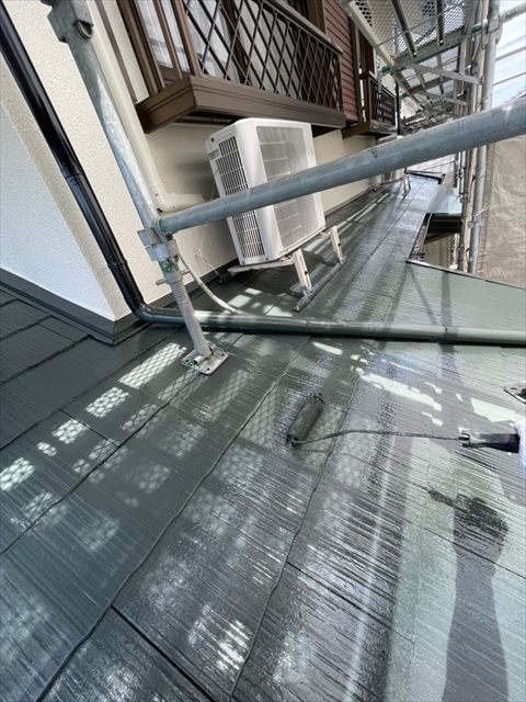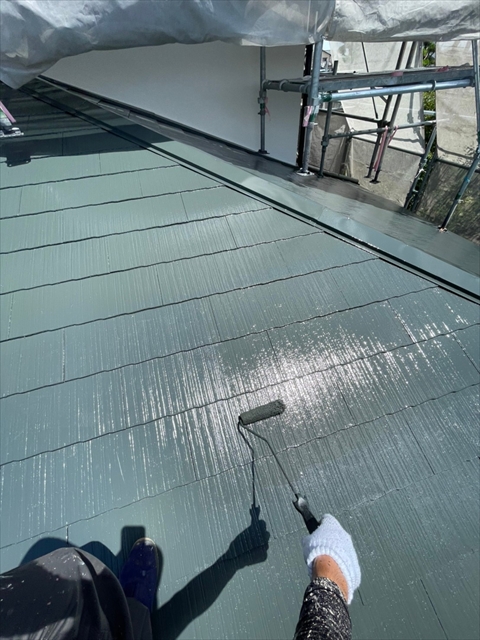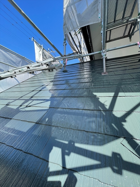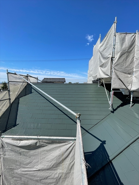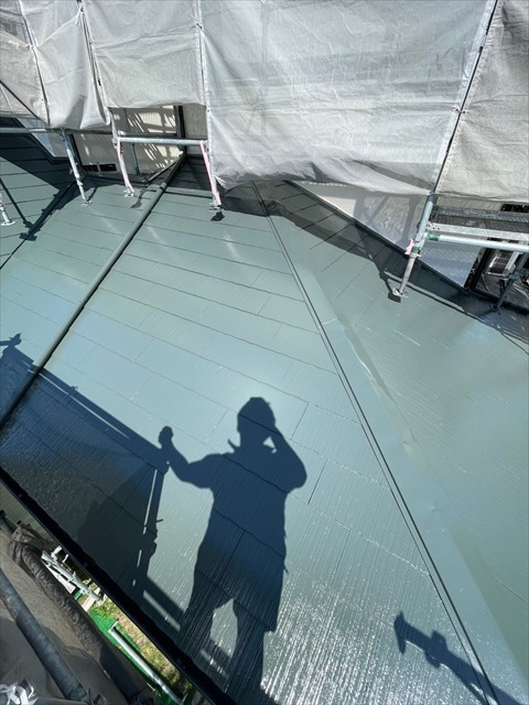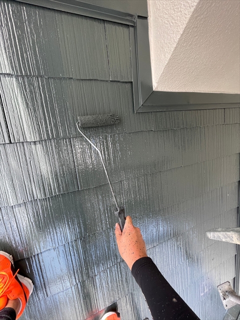 本日は下屋根、1F外壁上塗りを行いました。