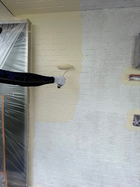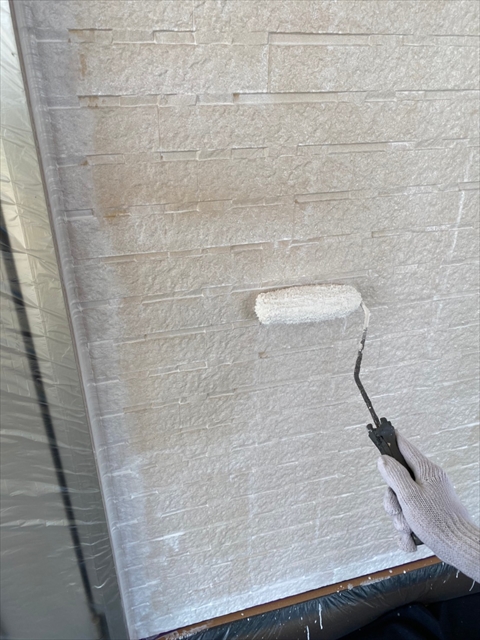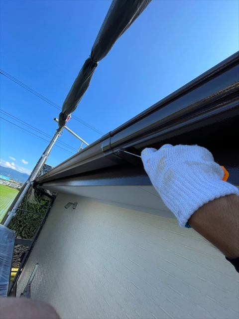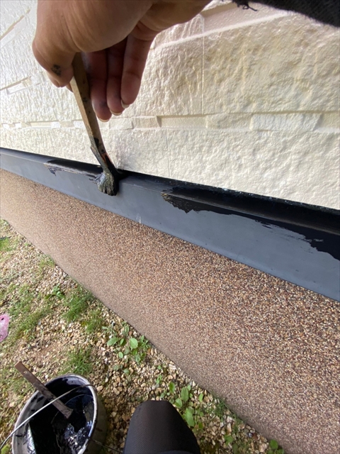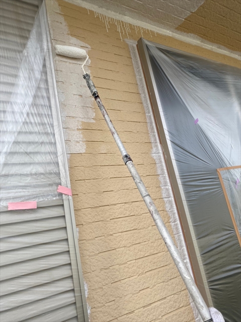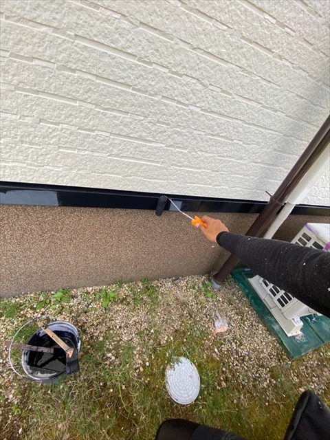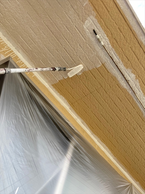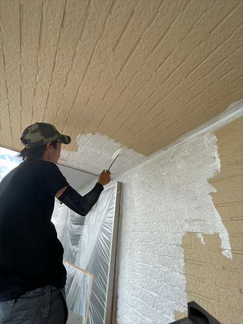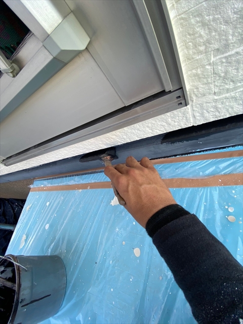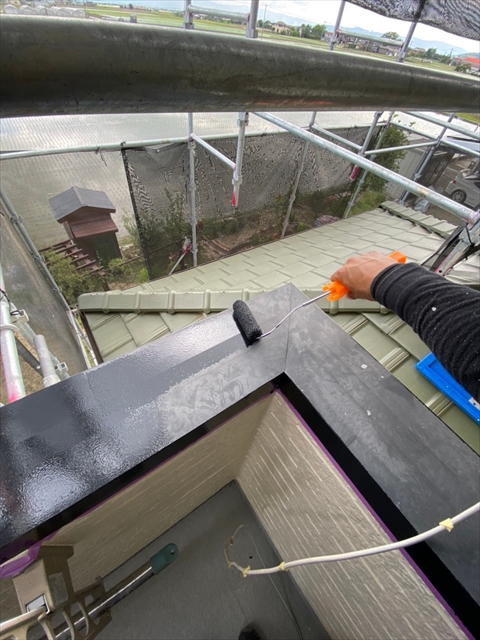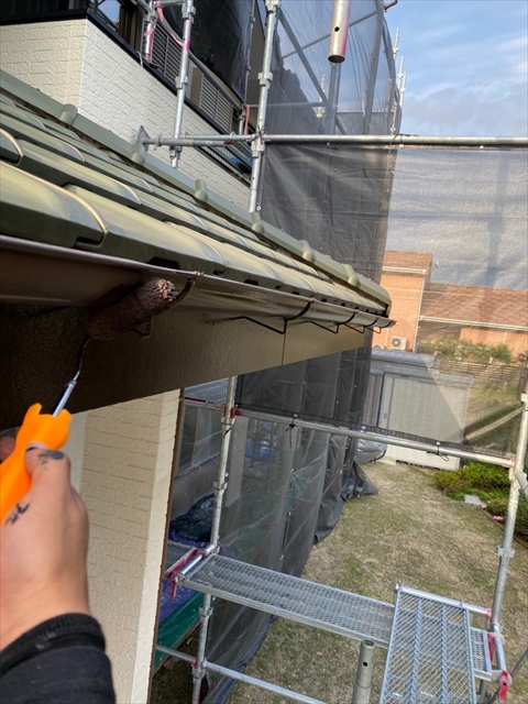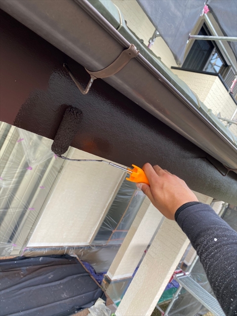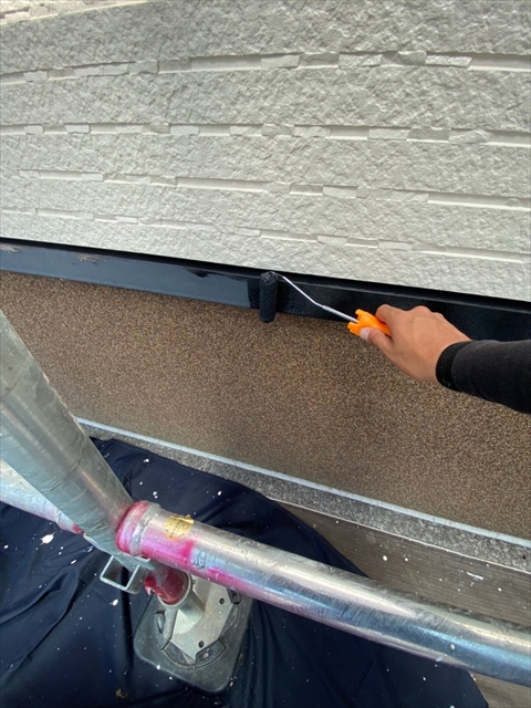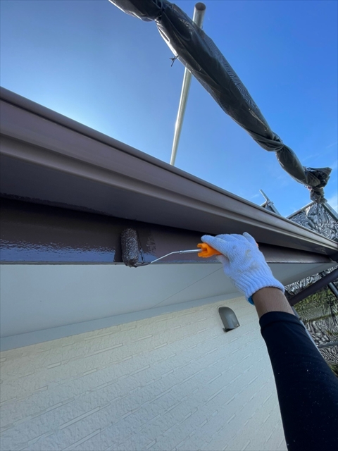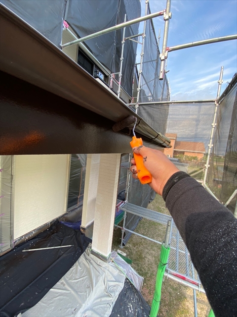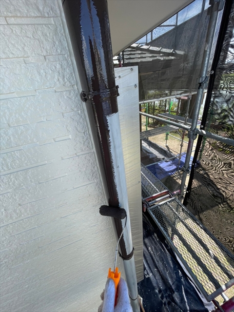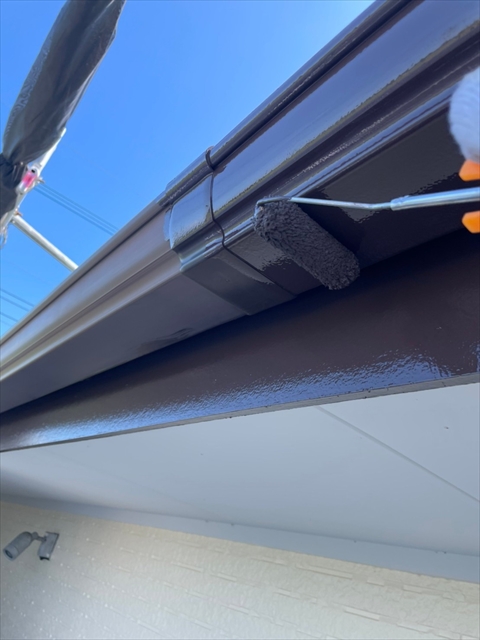 本日は、1階、2階の水切り板金塗装、1階、樋、破風塗装、1階南面下塗り、中塗り塗装を行いました。